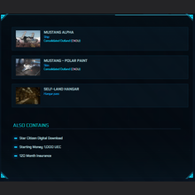 Contains: Star citizen game, Mustang alpha ship, Mustang polar paint, 10 year insurance, self land hangar and 1000UEC starting money.